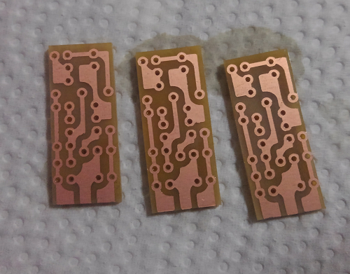とりあえず、制作不具合が無いか確認もしたいので、生基盤の切れっぱしに3個分基盤を起こしました。