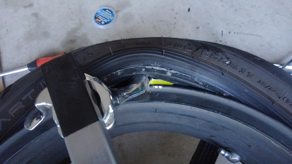 早速リアホイールを外してタイヤを外して状態を確認してみます。
