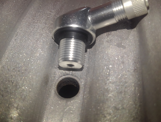 このタイプの横向きのバルブはどっち向きにどれ位の角度で付けるかなんてのがあるけど、オレ様の場合は、車両右向きで回転方向に対して斜め後ろを向くようにしてます。