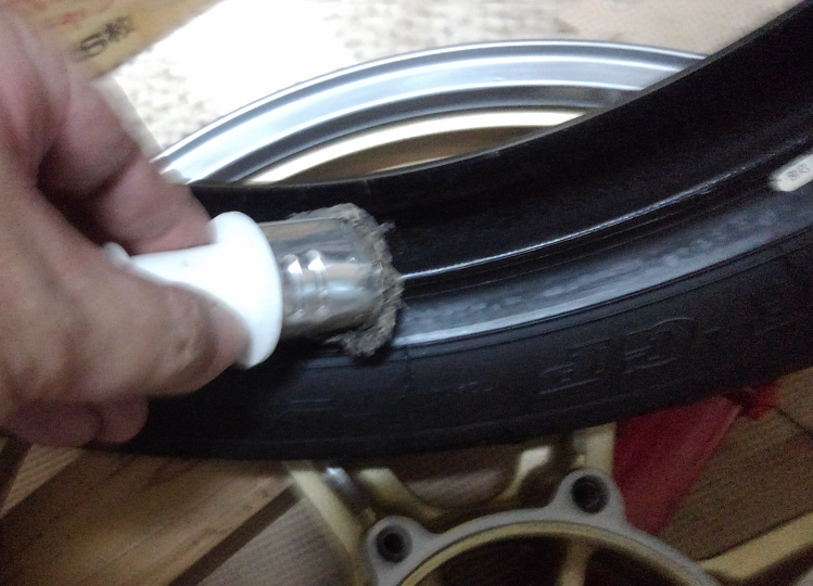 純正ホイールなんだし、こんなん規格でサイズが決まってるもんでしょ?と思いながらも調べてみたら、普通のバルブ穴は11.5ミリなんだけど、マグホイールなんかで8.5ミリなんかもあるとかなんとか。でもって、Z1100GPのホイールは8.5ミリのマイナーな穴サイズでした。