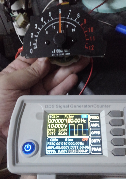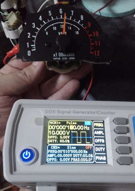 ファンクションジェネレーターで100Hzのパルスを作ります。これをタコメーターに食わせれば6,000rpmを指すはずなのに、6,400rpmあたりを指してます。
