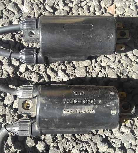 これ、上が元々車体に付いてたイグニッションコイルで、下が純正のイグニッションコイルです。なんかね、メーカーも型番も無い謎のコイルがついてました。何処までもアヤシイので、サッサと純正品のコイルに交換します。