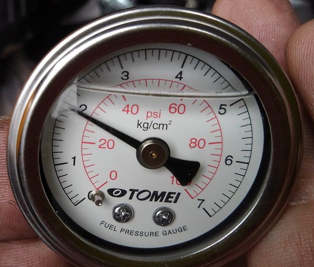 左がアイドリング負圧が効いてる時で、右がバキュームホースを外してオープンにした時の燃圧です。オープン時で2.5kg/cm位です。普通のNAエンジンの燃圧です。