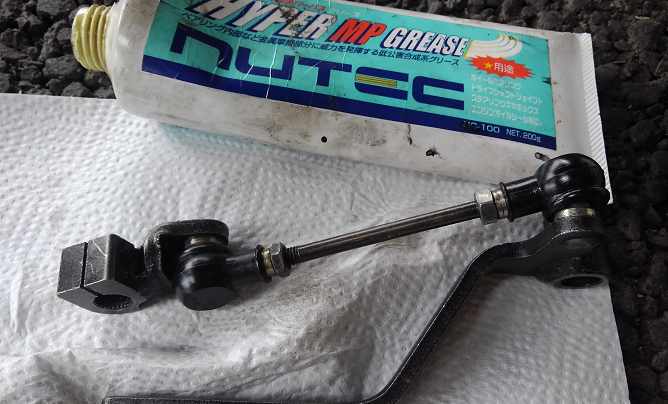 シフトペダルをAssyで外して、リンクロッドのターンバックルの部分から分解してヨーロッパ仕様のシフトペダルに交換します。ついでに、ゴムブーツを捲ってグリスを詰め込んであります。