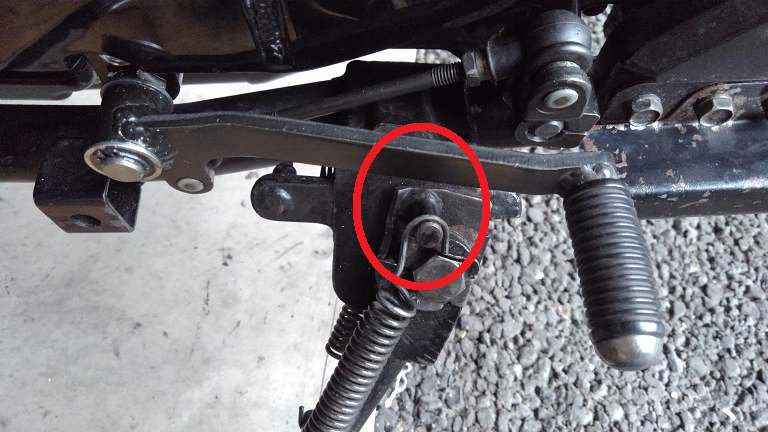 こちらでシフトペダルを交換したものの、素人ガレージにストックしていたシフトペダルが北米仕様だったらしくて、シフトペダルをイイ感じの位置に調整しようとすると、フレームのサイドスタンドブラケットに当たっちゃって調整しきれない状態になってました。