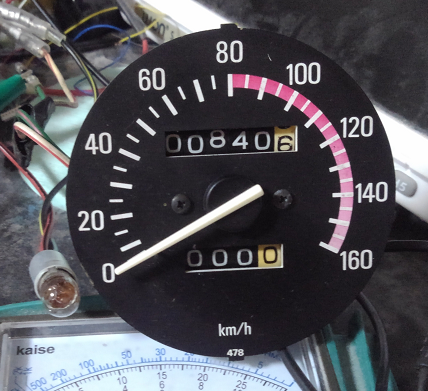 このRZのメーターに「だいたい速度警告灯増幅器」を接続します。配線の数が違うので、そのあたりのつじつまを合わせて接続します。