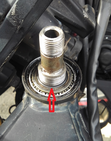 ロックナットを外すと、普通ならステムが下にスコーン!と落ちるんですが、カワサキのステムは矢印の部分にOリングが入っていて落ちません。このOリングを外すと、ステムが下に抜け落ちます。これ、何気に良く出来てるなぁって思います。