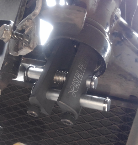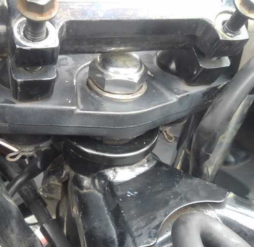 トップブリッジを外します。当然、ここにはクラッチ、ブレーキ、アクセル、スイッチボックスなんかがくっついてるんで、ここら辺から面倒くさくなってきます。