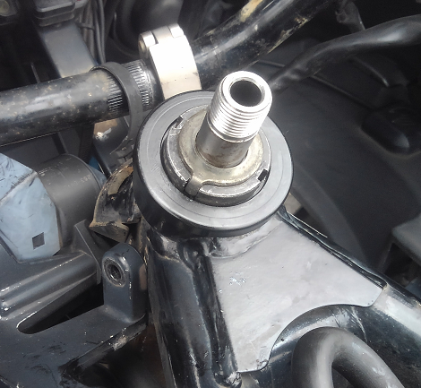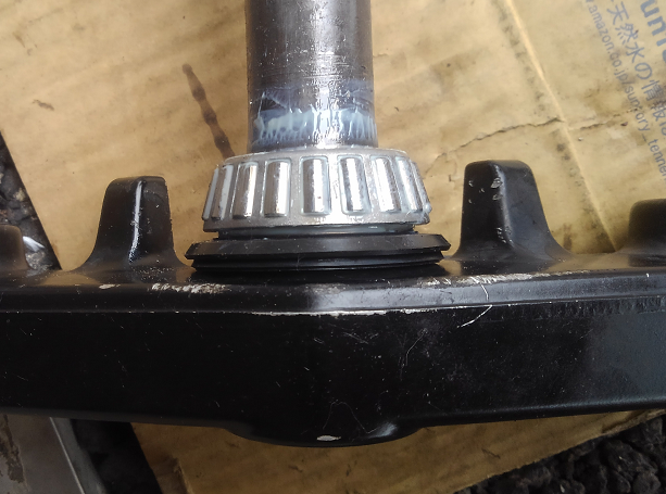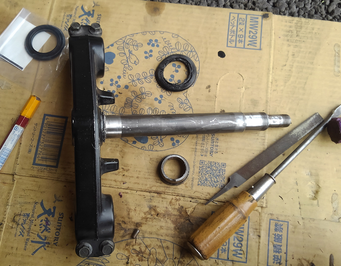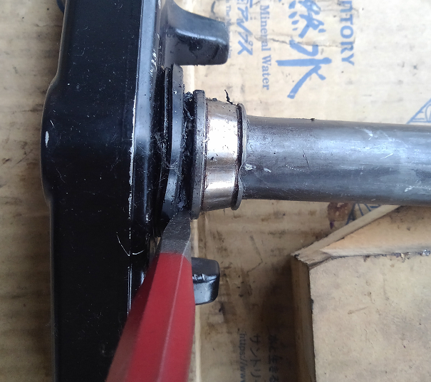 1時間近くかけてちょっとづつずらして外せたけど、次回はもうちょっと工夫した工具でも作ろう。これは、効率悪い上にステムシャフト側が傷だらけになります。