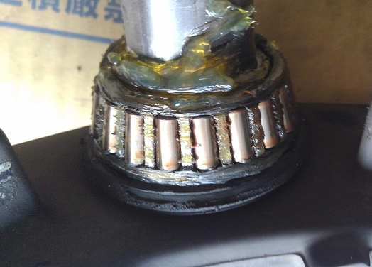 ベアリングを確認してみます。ローラーベアリングの方は、一見何ともないです。ベアリングレースの方は、かなり打痕がついてます。指で触ると波打ってます。