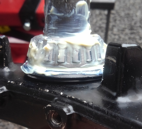 上側のベアリングもグリースだらけにして戻してからロックナットで固定してトップブリッジを戻します。