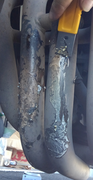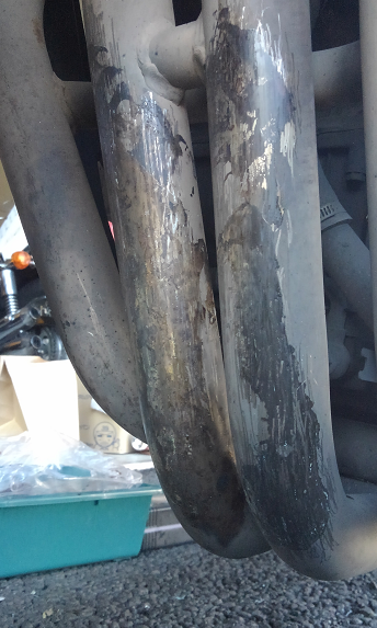 「エキパイの掃除って?」ってなるでしょ?実は半月位に、走行中何処からともなく飛んできたコンビニ袋がエキパイにくっついて溶けて一体化しちゃったんです。コンビニ袋1枚丸っとエキパイにくっついたせいで、毎回乗る度にビニールの溶けた匂いが酷くてしかたないので、へばりついて焦げてるビニールを削り落とす事にします。