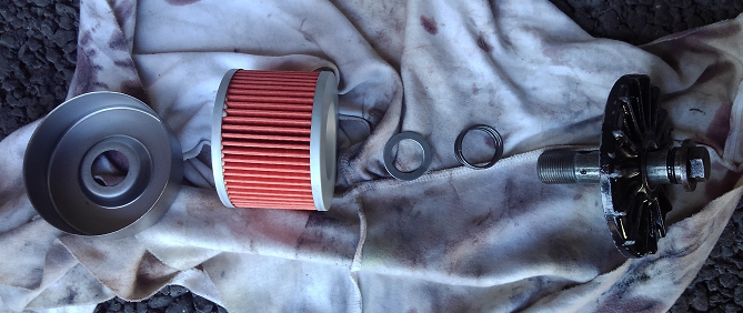 外したドレンボルトとエレメント周りの部品です。綺麗なもんで、特に汚れも変な所もありません。