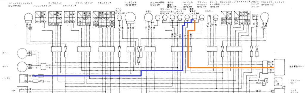 これって、ヤマハの配線図が間違ってるってこと?警告灯リレーが実際に車体についてるんだから、配線図が間違ってるんだろうけど。