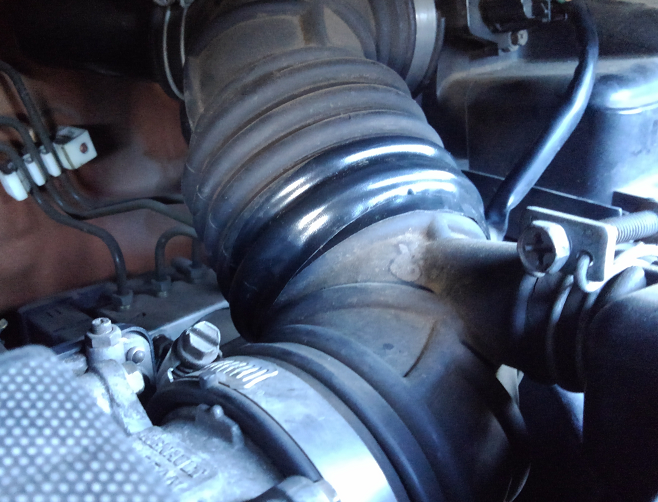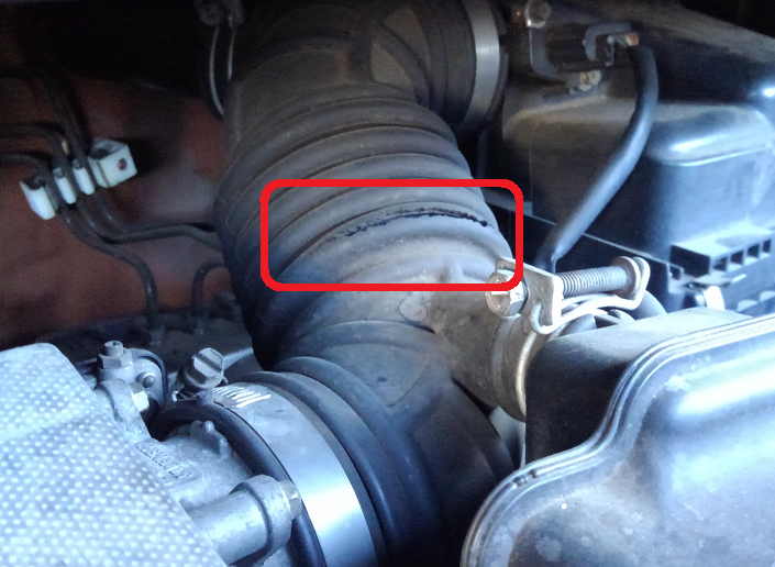 このインテークパイプ、手前がエンジンで奥のホースバンドで止まってて配線が刺さってるヤツがエアフロメーターです。エアフロメーターでエンジンが吸い込む空気量を測っているので、このパイプの部分に写真のような穴があると余分なエアーを吸い込んでエアフロメーターで測った空気量より空気量が増えて、結果燃料が薄くなります。しかも、ターボのついていないNAエンジンだと、これ位の裂け目ならエンジン回転数が上がって流れる空気の量が増えると、空気の流速で裂け目からは空気を吸わなくなって普通に走れるというオマケ付き。