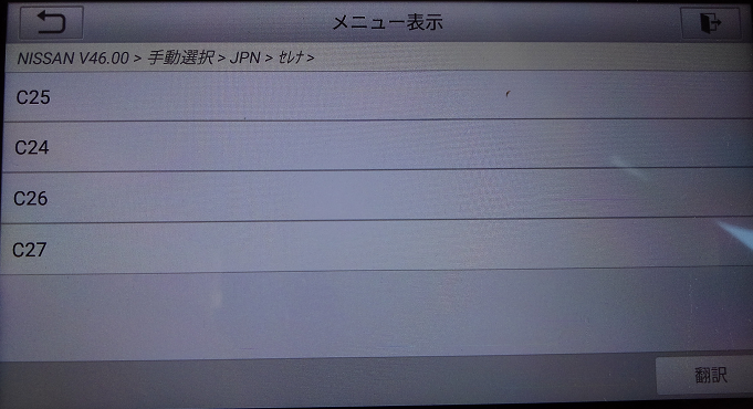 いつも通り、OBD2診断機を使います。C25セレナはVINコード自動読み込みに対応してないんで、メニューから車種を選ばないといけないのが面倒くさいです。