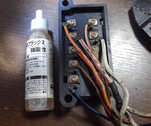 強酸性フラックスです。古い配線や端子は表面に酸化膜が出来ていて、酸化膜が半田を弾くんです。なので、綺麗に表面を削てやればいいんですが、配線は線束なんで上手く磨けないし、端子も平面はいいけど、平面以外は磨けないですよね。そこで、強酸性フラックスです。