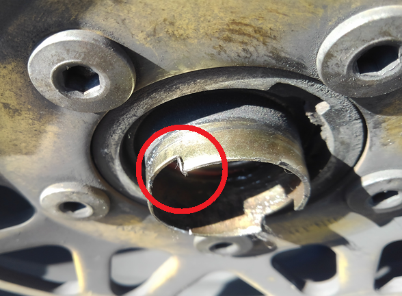 このレシーバーって本来はハブベアリングと抜け止めのCクリップの間である程度自由に動くクリアランスがあって、触るとガシャガシャに動くものなんですが、汚れで全然動きませんでした。なるほど、本来ある程度自由に動いてスピードメーターギヤに噛んでるのが、全然動かなくなってスピードメーターギヤの噛みがズレた状態で回転してたって事かな。これが原因で確定っぽいですな。