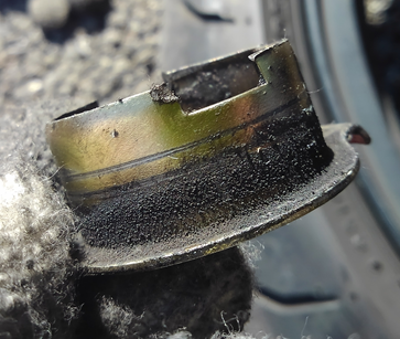 外したホイールのハブ周りをよーく観察しながら、軍手で触っていると妙に軍手が引っかかり、「おや?」と思ってよくよく見てみると、原因らしきもの発見!