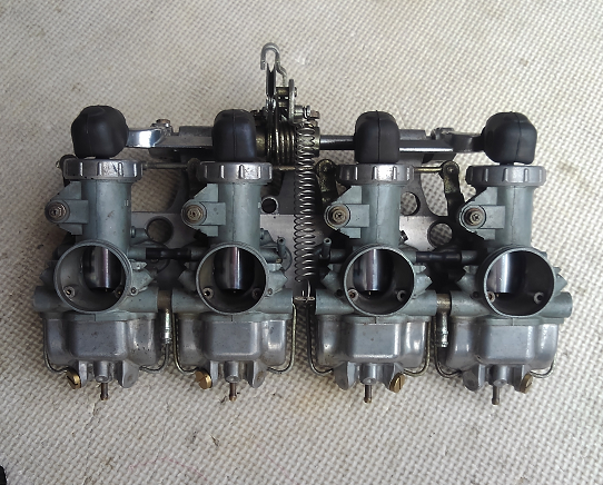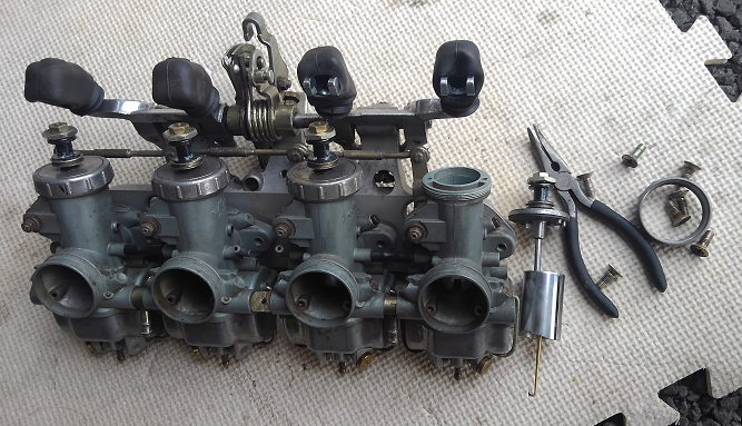 とっととキャブレターを下ろします。CBのキャブレターのニードルを弄るにはスロットルのリンケージを外す必要があり、それにはキャブレターの連結プレートを外す必要があります。よくあるキャブレターみたいに”トップキャップを外すだけ”なんて簡単にはいかないです。