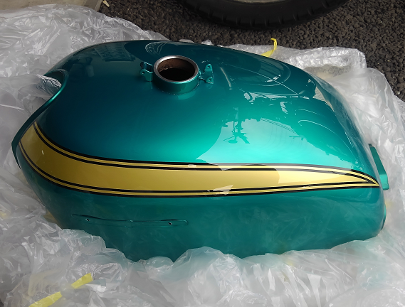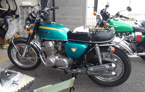 素人ガレージのCB750Fourといえばオッサンシルバーなんですが、実はあの色は”世を忍ぶ仮の姿”で、元々はK0,K1のキャンディーブルーグリーンです。ただ、塗装が悪くてだいぶ前に全塗装に出してました。ところが塗装にはかなり待たされるということで、シルバーの外装を入手して仮に取り付けていただけなんです。