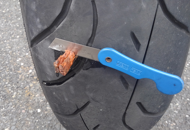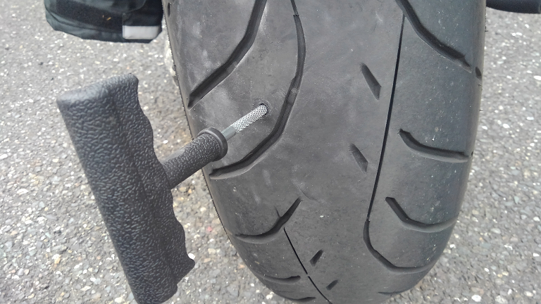 これである程度の大きさまで穴を広げないとパンク修理材が差し込めないんです。かといって穴が大きすぎるとパンク修理材が抜けちゃうんで、程々な大きさにしないとダメなんです。オレ様的にはパンク修理はココが一番難しいです。