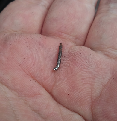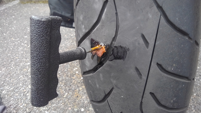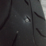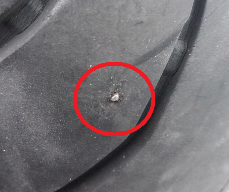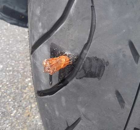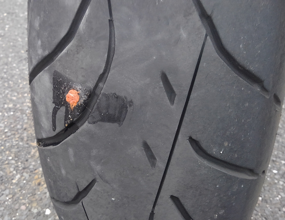 この細さの釘のパンクって、パンク修理が大変なんだよねぇ。穴が小さすぎて修理用の下穴を作るのが大変なんです。