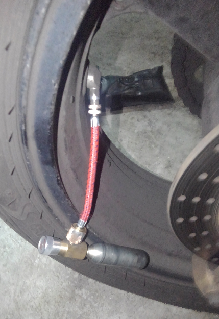 これ以上はその場ではどうしようもないので、タイヤを労わりながら素人ガレージまで自走して普通に空気を入れておきました。