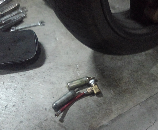 さすがに空気入れは持ってないけど、代わりに2酸化炭素ボンベを持っているので、これで空気を入れます。